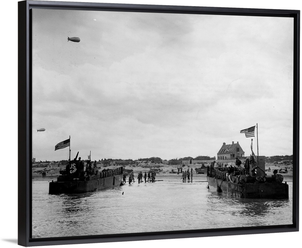 <p>Two American landing crafts land troops and supplies on the 'Green Beach' area of Utah Beach two days after the initial invasion ofNormandy, 8 June 1944.</p>