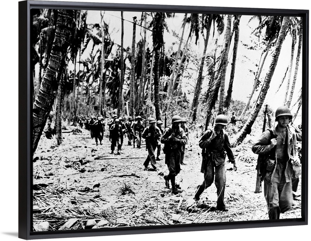 <p>U.S. Marines advance into the village of Matanikou during the Battle of Guadalcanal, Solomon Islands, 24 December 1942.</p>