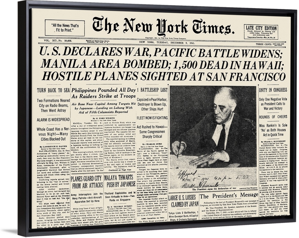 <p>The front page of 'The New York Times,' 9 December 1941, announcing the United States' declaration of war with with Japan after theattack on Pearl Harbor.</p>