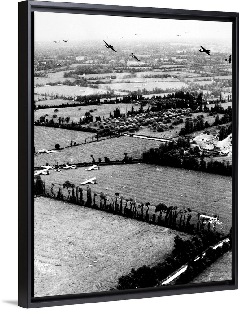 <p>Gliders of the U.S. Ninth Air Force land in Normandy, France, during the D-Day invasion, 6 June 1944. Some gliders have already landed in fields, while C-47 tow planes circle overhead.</p>