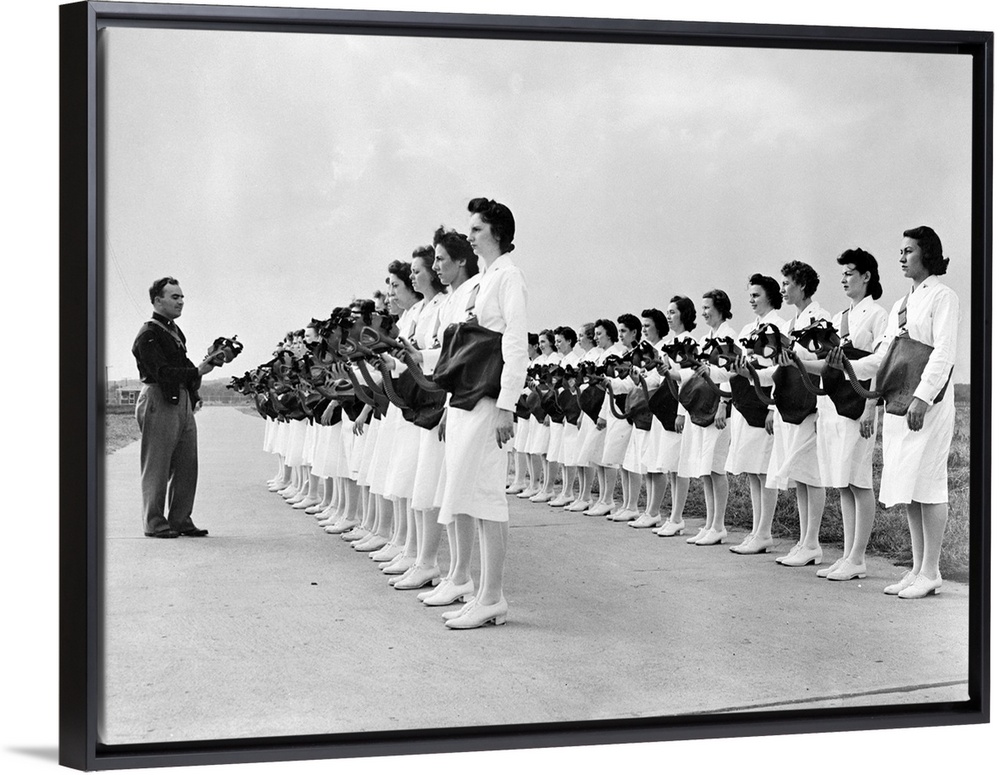 <p>U.S. Army Lieutenant Edward W. Gopp, demonstrates to members of the nurse corps the proper way to put on a gas mask, during training at Scott Field, Illinois. Photograph, c1942.</p>