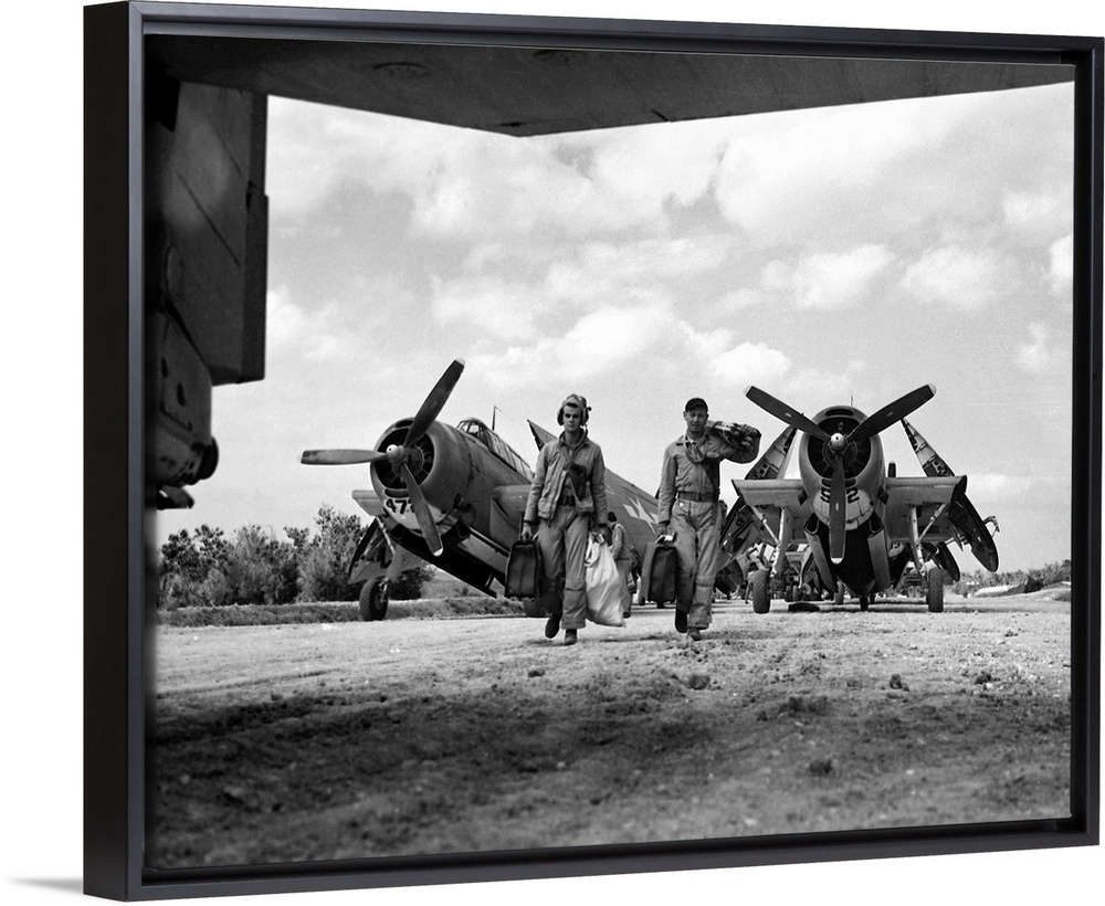 <p>Two pilots of the U.S. Second Marines Air Wing 'Red Devils' torpedo bomber squadron at Kadona Airfield, Okinawa, Japan. Photographed 1945.</p>