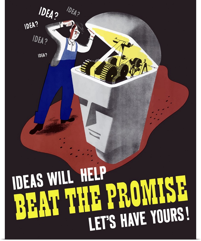 <p>Vintage World War II poster of a man inspecting the inner workings of a statue's brain. It reads, Ideas Will Help Beat The Promise Let's Have Yours!</p>