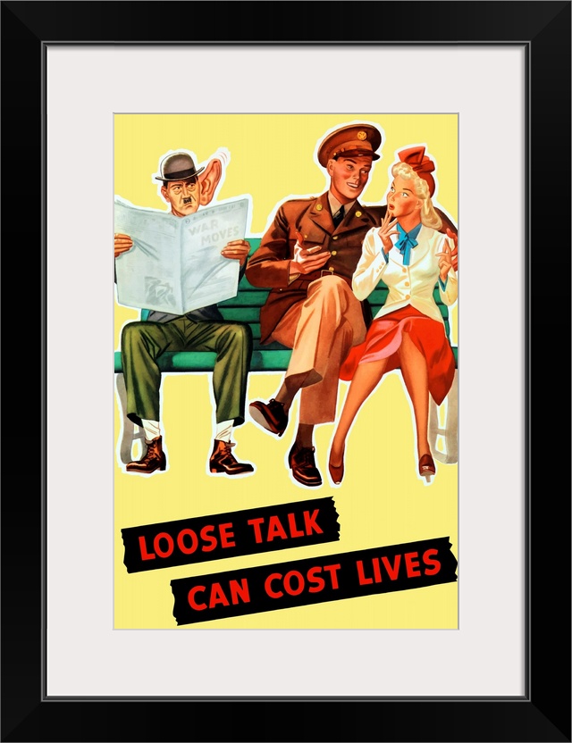 <p>Vintage World War II poster of a soldier talking to his girl on a bench, as Hitler eavesdrops while reading the newspaper. It reads, Loose Talk Can Cost Lives.</p>