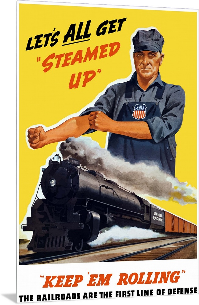 <p>Vintage World War II poster of a train engineer rolling up his sleeves and a locomotive steaming down the track. It reads, Let's all get steamed up, keep 'em rolling, the railroads are the first line of defense.</p>