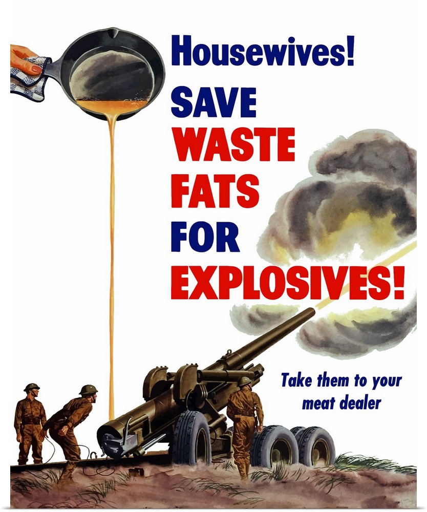 <p>Vintage World War II poster of grease from a frying pan being poured into a firing artillery gun. It reads, Housewives! Save waste fats for explosives! Take them your meat dealer.</p>