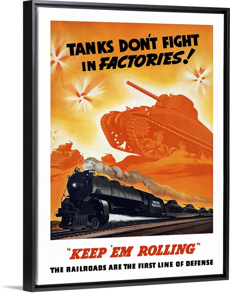 <p>Vintage World War II poster of tanks rolling into battle and a locomotive steaming down the tracks. It reads, Tanks don't fight in factories, keep 'em rolling, the railroads are the first line of defense.</p>