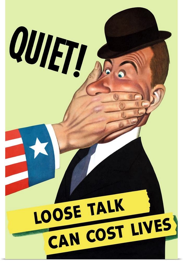 <p>Vintage World War II poster showing the hand of Uncle Sam covering the mouth of a man in a hat. It reads, Quiet! Loose Talk Can Cost Lives.</p>