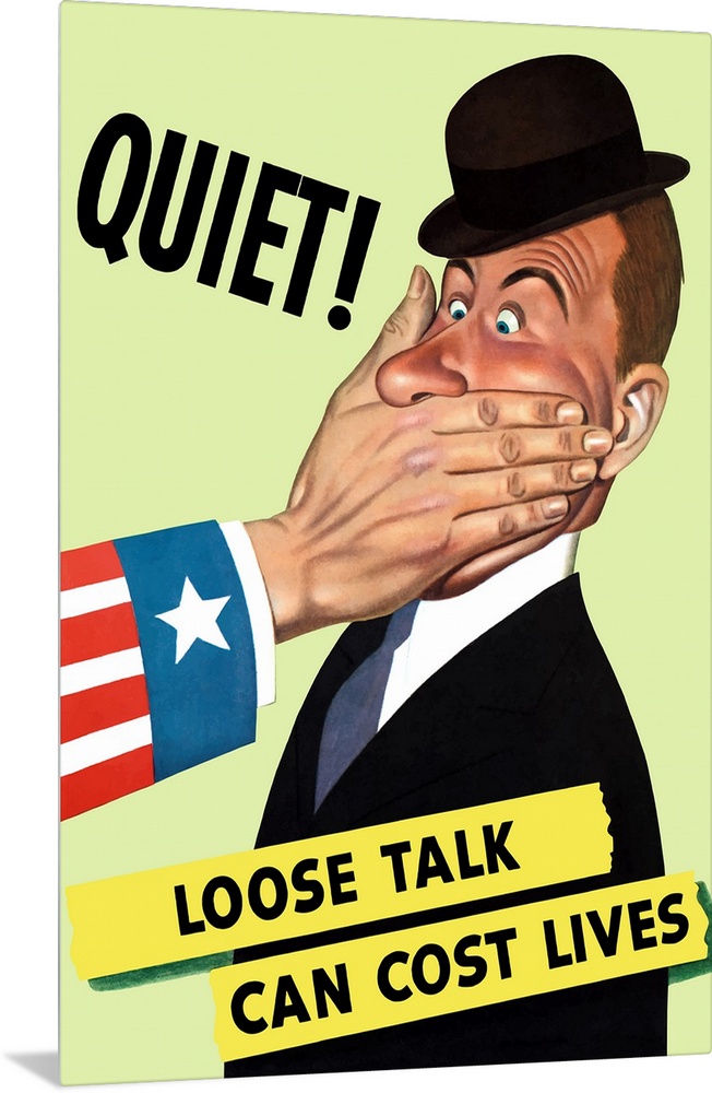<p>Vintage World War II poster showing the hand of Uncle Sam covering the mouth of a man in a hat. It reads, Quiet! Loose Talk Can Cost Lives.</p>