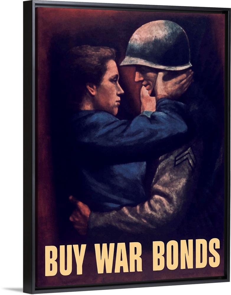 <p>Vintage World War II propaganda poster featuring a soldier embracing a woman. It reads, Buy War Bonds.</p>