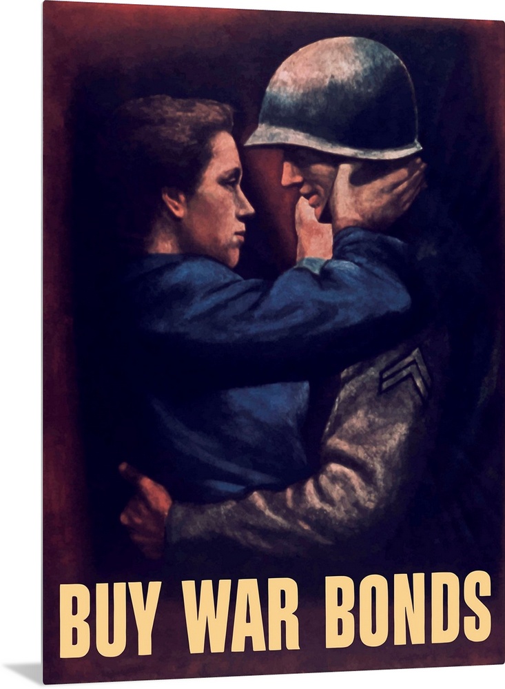 <p>Vintage World War II propaganda poster featuring a soldier embracing a woman. It reads, Buy War Bonds.</p>