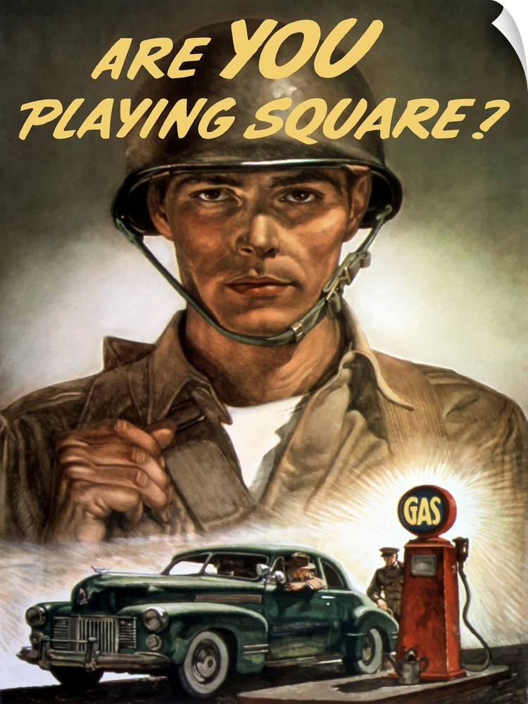<p>Vintage World War Two propaganda poster featuring a soldier overlooking a man, filling up his car at the gas pump. It reads, Are You Playing Square?</p>