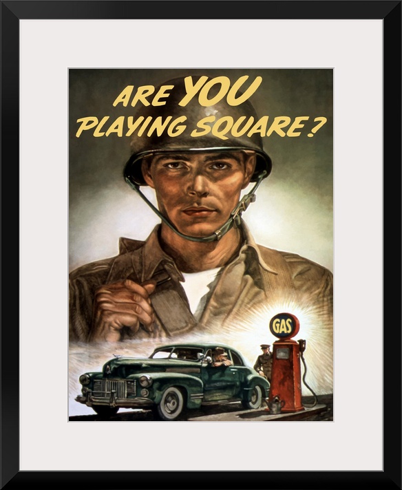 <p>Vintage World War Two propaganda poster featuring a soldier overlooking a man, filling up his car at the gas pump. It reads, Are You Playing Square?</p>