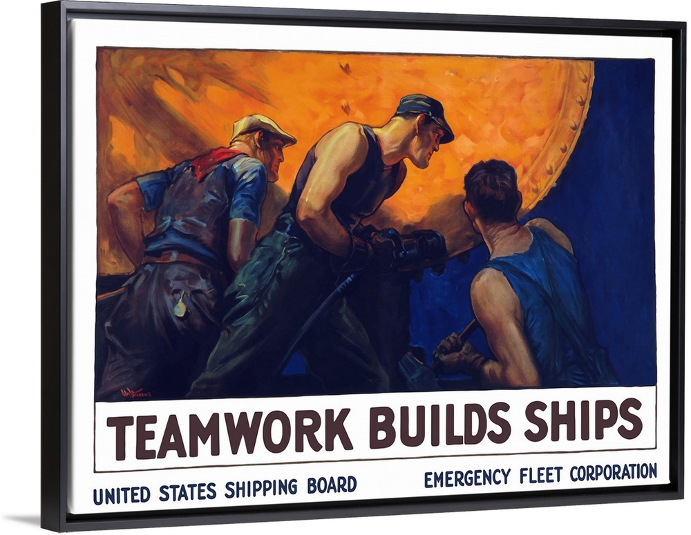 <p>Vintage World War II propaganda poster featuring a team of three men riveting the hull of a ship. It reads, Teamwork Builds Ships, United States Shipping Board Emergency Fleet Corporation.</p>