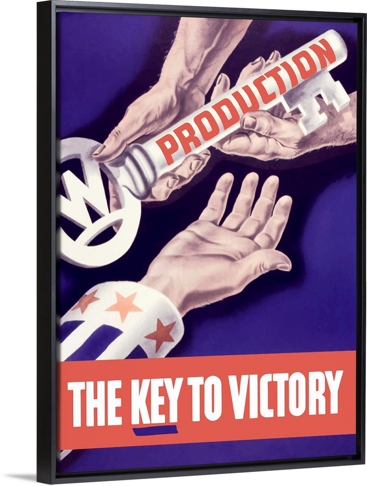 <p>Vintage World War II propaganda poster featuring someone handing a large key to the hand of Uncle Sam. It reads, Production, The Key To Victory.</p>