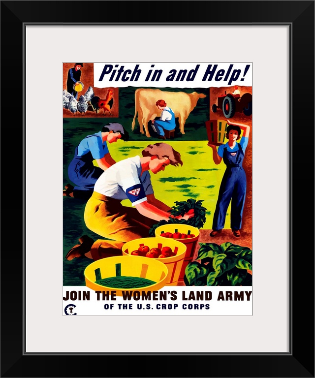 <p>Vintage World War II propaganda poster featuring several women doing various chores on a farm. It reads, Pitch in and Help! Join The Women...s Land Army Of The U.S. Crop Corps.</p>