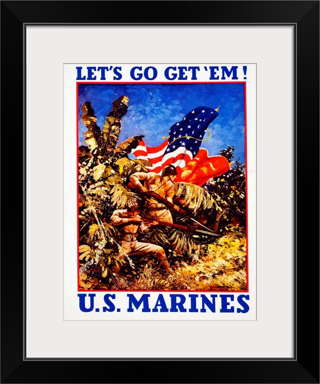 <p>This World War II recruiting poster shows marines bearing rifles with bayonets in a jungle: 'Let's go get 'em! U.S. Marines, ' c. 1942.</p>