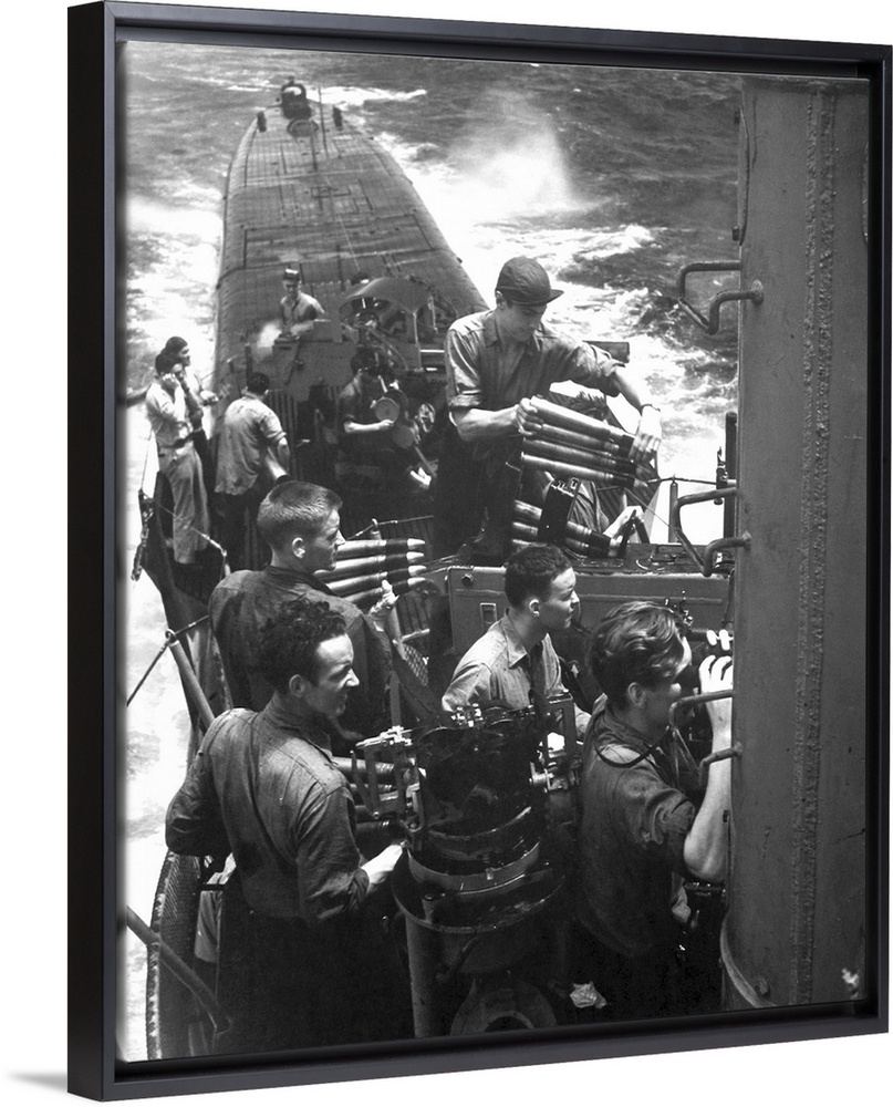 <p>Crew members aboard a U.S. submarine practice firing as they return to base from a successful war patrol, 1945.</p>