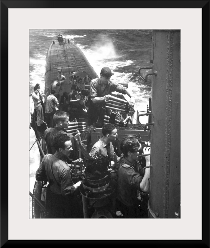 <p>Crew members aboard a U.S. submarine practice firing as they return to base from a successful war patrol, 1945.</p>