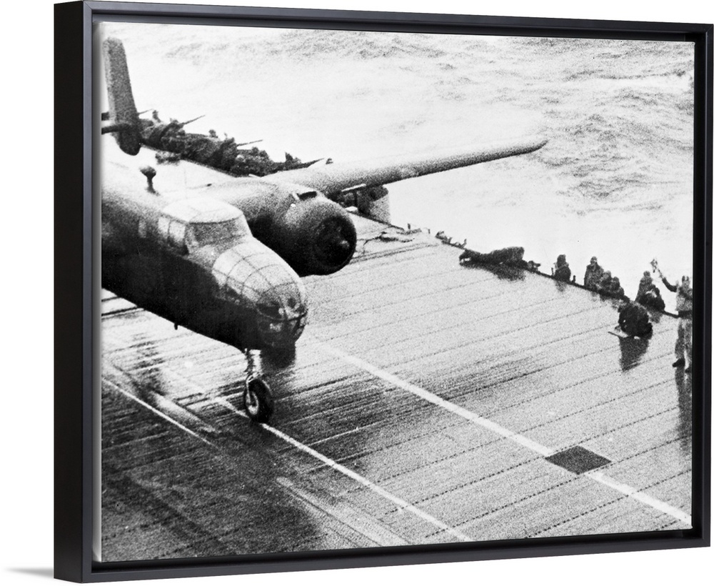 <p>An Army Air Force B-25, under the command of Major General James H. Doolittle, takes off from the aircraft carrier USS Hornet to attack Japan. Photographed 1942.</p>