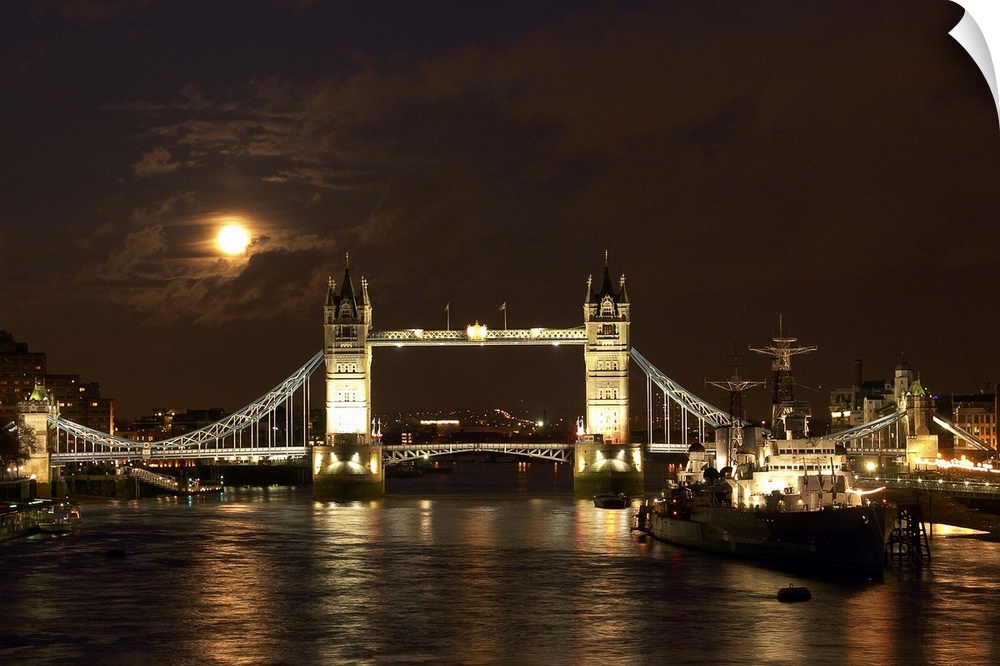 <p>The dramatic view looking east along the river Thames past the World War Two warship HMS Belfast towards a full moon rising over Tower Bridge.</p>