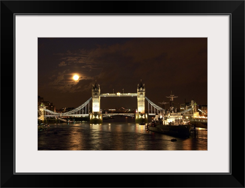 <p>The dramatic view looking east along the river Thames past the World War Two warship HMS Belfast towards a full moon rising over Tower Bridge.</p>