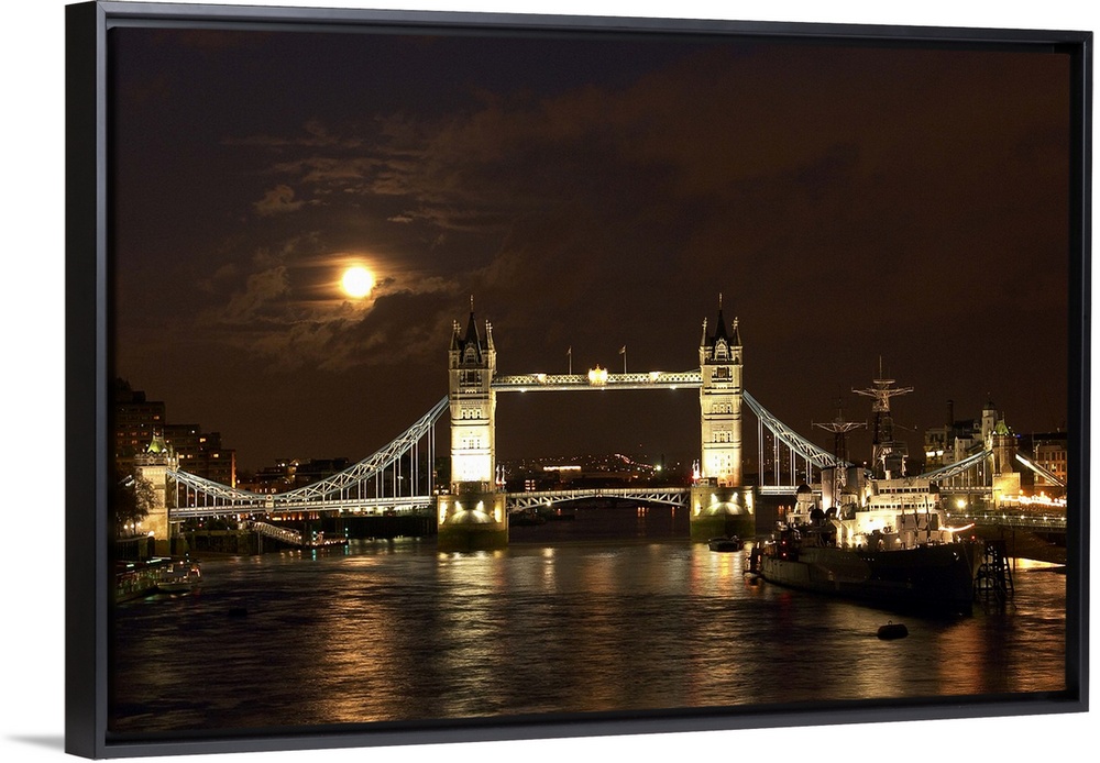 <p>The dramatic view looking east along the river Thames past the World War Two warship HMS Belfast towards a full moon rising over Tower Bridge.</p>