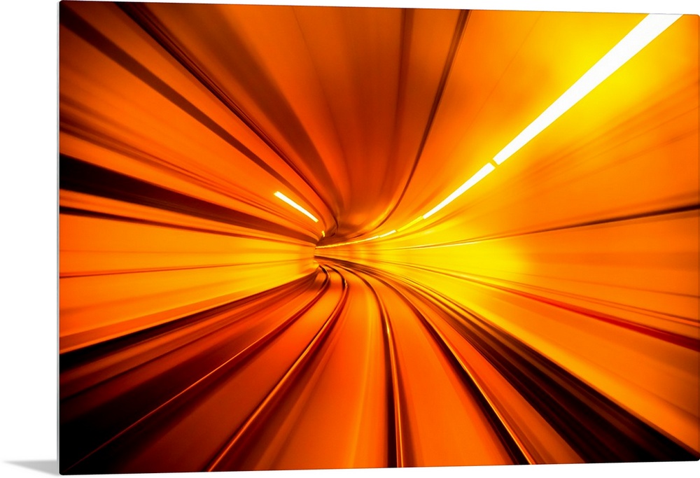 <p>Neon lights line a round tunnel in a blur of speed.</p>