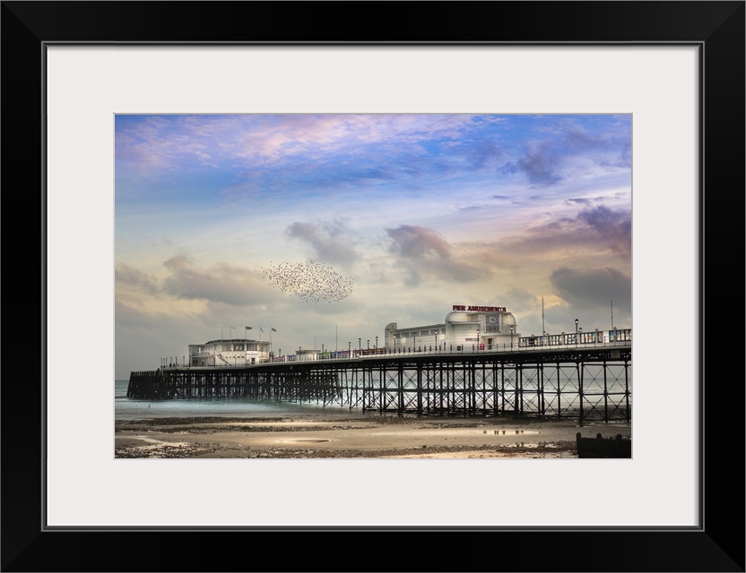 <p>Coastal view in West Sussex, England. Worthing Pier is a pier in Worthing, West Sussex, England. Designed by Sir Robert Rawlinson, it was opened on 12 April 1862 and remains open. The Pavilion Theatre and Denton Cafe is situated at the northern, land end of the pier.</p>