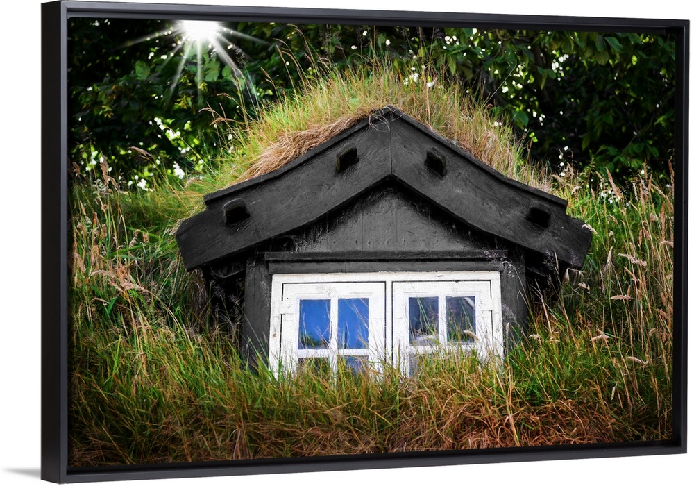 <p>Sunlight shining over a window in the grassy roof of a house.</p>