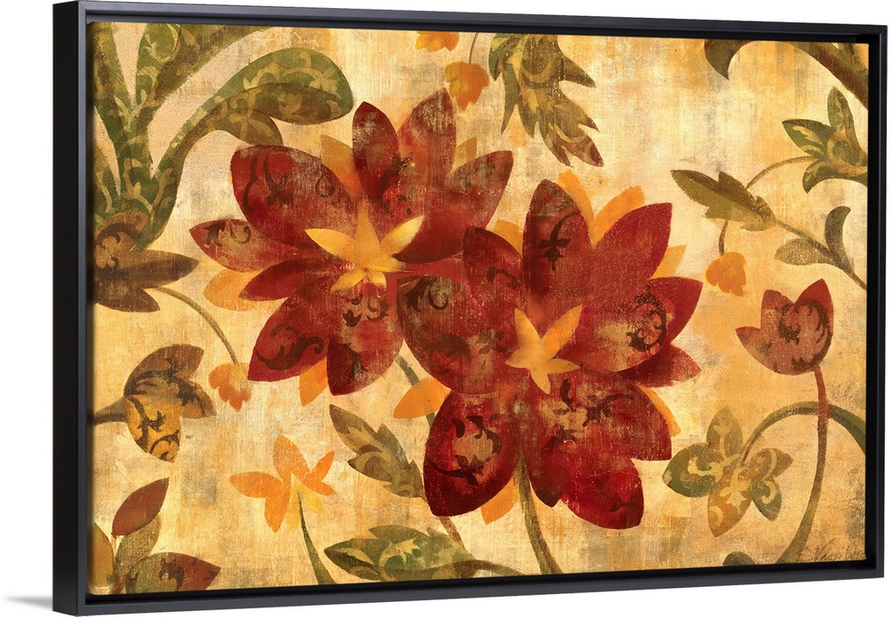 <p>Giant, landscape, floral home art docor of large, warm flowers surrounded by twirling leaves and branches on a golden, antiqued background. Some areas have small swirling patterns inside of leaves and petals.</p>