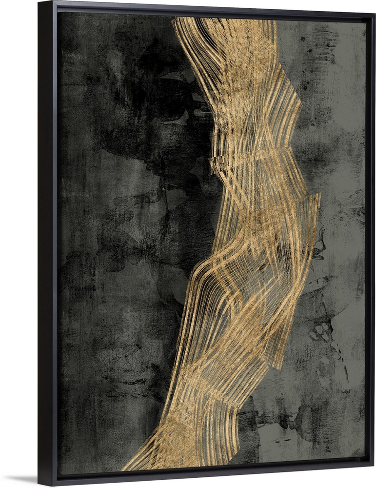 <p>Abstract contemporary artwork with gold wavy lines crossing through dark grey.</p>