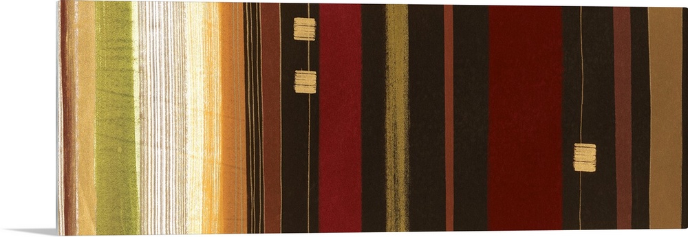 <p>A abstract painting of dark different colored lines running vertical through the image. With three squares hovering in the image.</p>