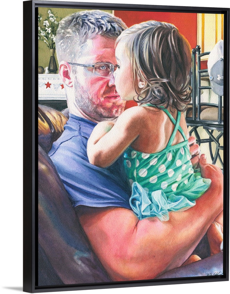 <p>A vertical watercolor painting of a father holding is daughter.</p>