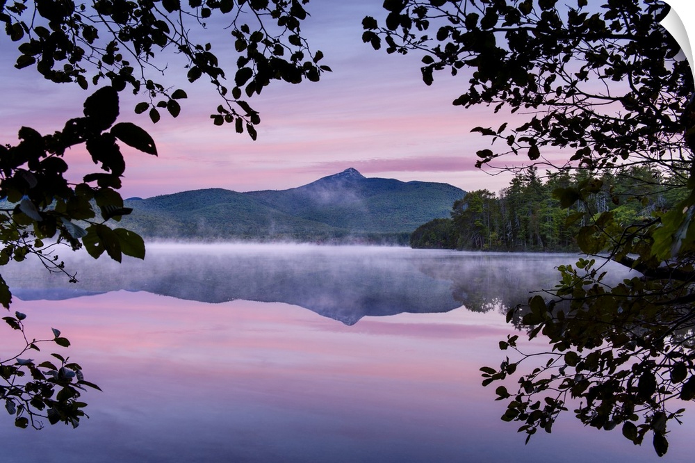 <p>Landscape photograph of a mountain view reflecting onto a foggy lake with a pink and purple sunset framed by leafy tree branches.</p>