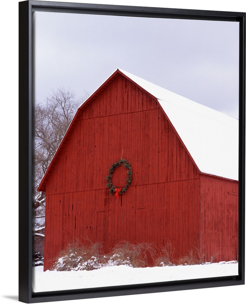 <p>Big photo on canvas of a farm building decorated for Christmas in the snow.</p>