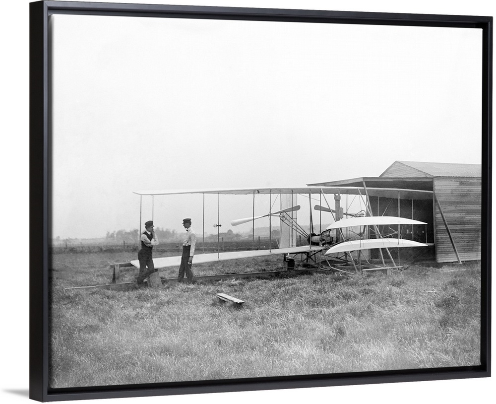 <p>Wright Flyer II and the Wright brothers. Orville Wright (left, 1871-1948) and Wilbur Wright (right, 1867-1912) with the Wright Flyer II, at Huffman Prairie, Dayton, Ohio, USA, in May 1904. The Wright brothers built and flew the first powered aircraft (the Wright Flyer) on 17 December 1903, adding an engine and propellers to one of their glider designs. Their second design, built from white pine, had a slightly more powerful engine. Like the first machine, it was a single-pilot aircraft. They flew this aircraft 105 times that year, with some flights lasting up to five minutes. Over the winter, the aircraft was dismantled, with salvaged parts used for the Wright Flyer III.</p>