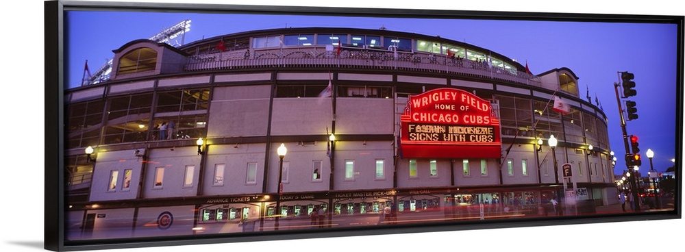 <p>Panoramic photograph of the outer walls and sign of Wrigley Field where the Chicago Cubs play baseball, taken in the early evening.</p>