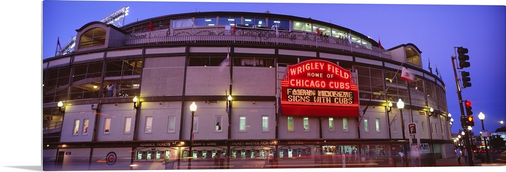 <p>Panoramic photograph of the outer walls and sign of Wrigley Field where the Chicago Cubs play baseball, taken in the early evening.</p>