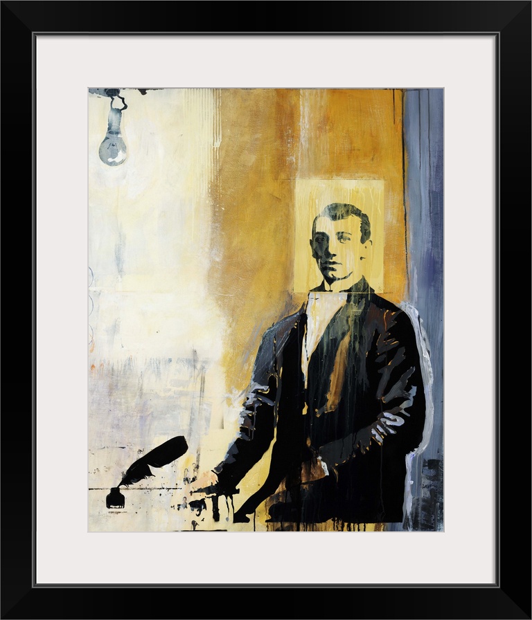 <p>Figurative painting of a man in a jacket, standing at a table next to a feathered pen and bottle of ink. A single lightbulb hangs in the top left, on a multicolored background of thick vertical stripes.</p>