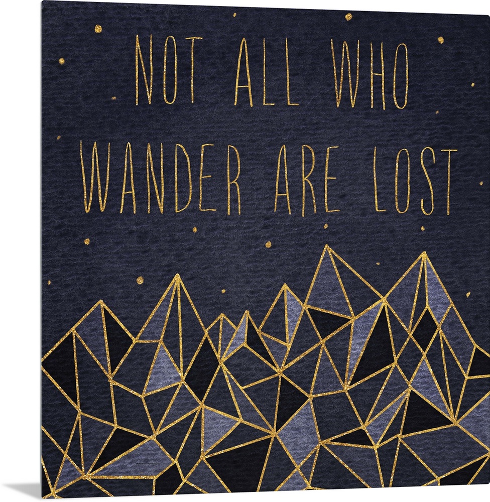 <p>"Not all who wander are lost" over crystalline mountains with gold lines under the stars.</p>