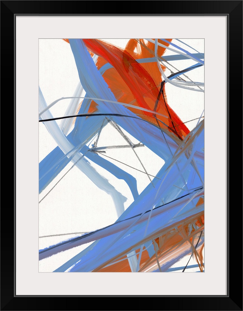 <p>Contemporary abstract painting in strong strokes of blue and red over white.</p>