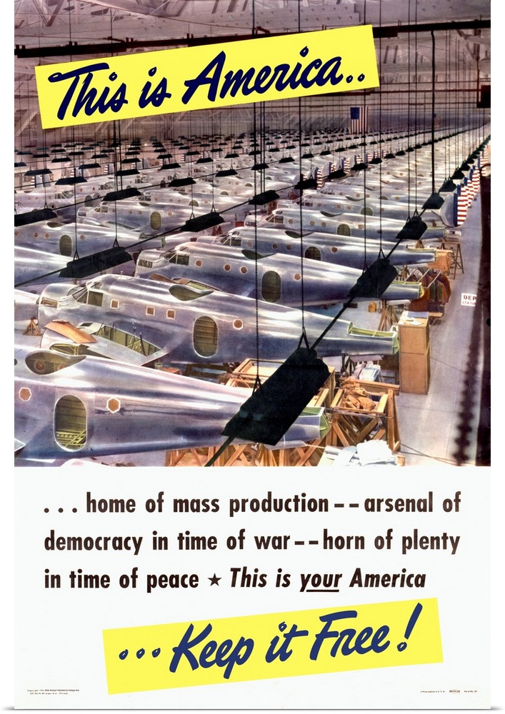 <p>A powerful wartime propaganda poster showcasing a vast aircraft assembly line, symbolizing the might of American industry. With patriotic language celebrating freedom, democracy, and mass production, it served as a rallying cry for workers and citizens to uphold their roles in preserving liberty through industrial strength.</p>