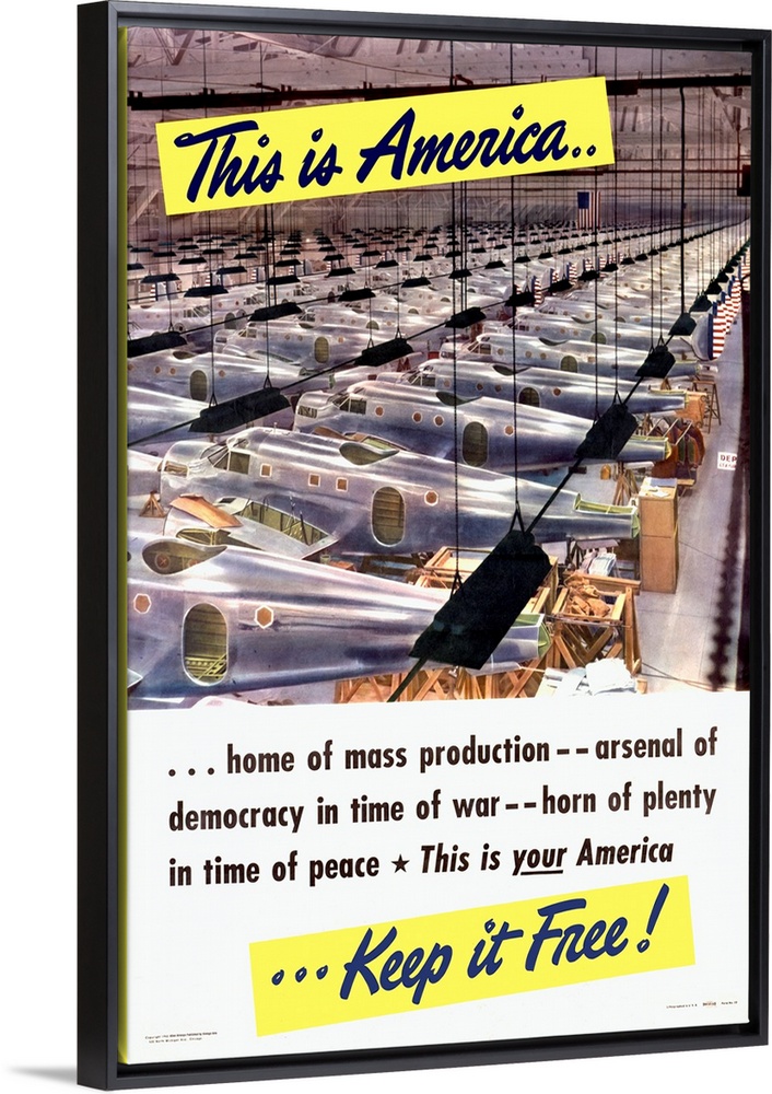 <p>A powerful wartime propaganda poster showcasing a vast aircraft assembly line, symbolizing the might of American industry. With patriotic language celebrating freedom, democracy, and mass production, it served as a rallying cry for workers and citizens to uphold their roles in preserving liberty through industrial strength.</p>