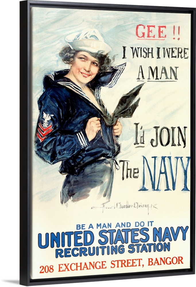 <p>A famous WWI Navy recruitment poster featuring a confident woman in a sailor uniform, provocatively stating: "Gee!! I wish I were a man-I'd join the Navy." The poster encouraged men to enlist by appealing to both patriotism and masculine identity. A classic example of Christy's romanticized, persuasive style.</p>