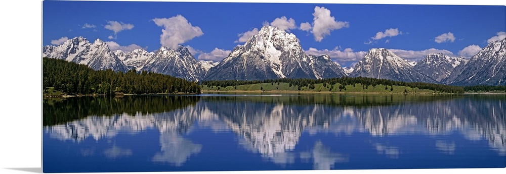 <p>Large panoramic photo of calm water with rugged snow capped mountains in the distance.</p>
