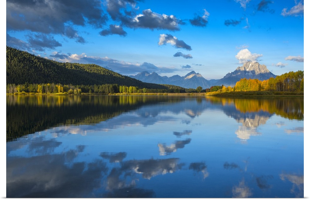 <p>USA, Wyoming, Rocky Mountains, Teton County, Grand Teton National Park, Reflections of Mount Moran at Oxbow Bend of the Snake River.</p>