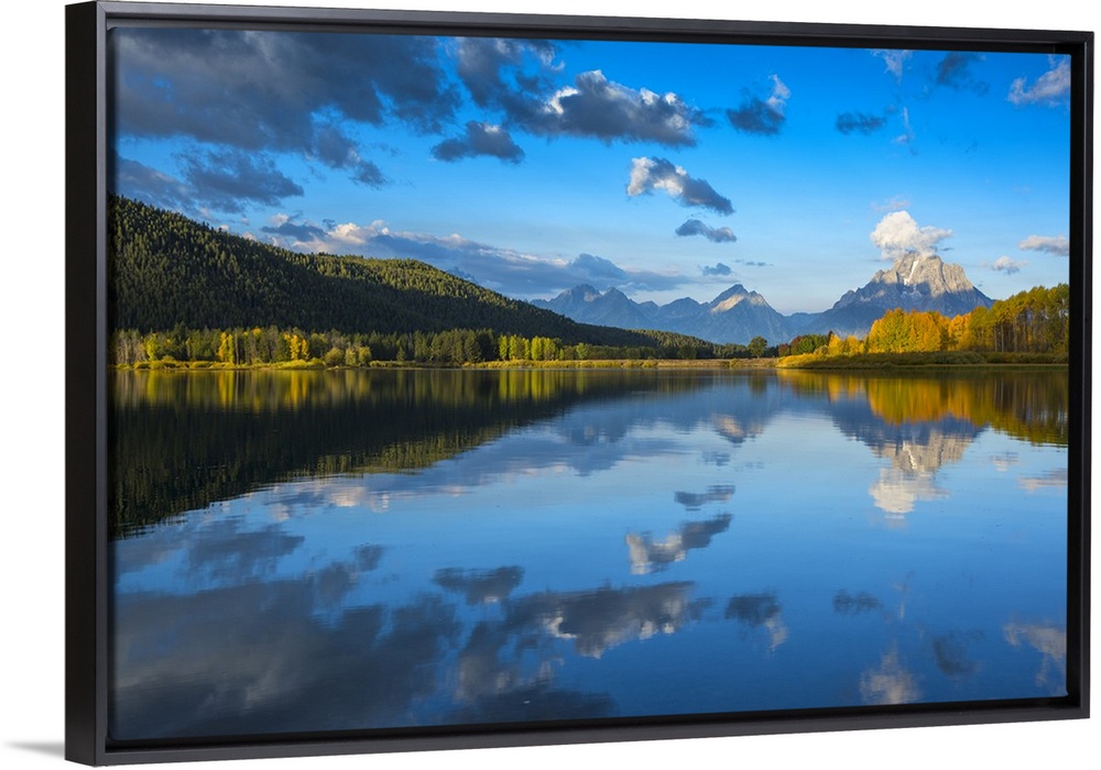 <p>USA, Wyoming, Rocky Mountains, Teton County, Grand Teton National Park, Reflections of Mount Moran at Oxbow Bend of the Snake River.</p>
