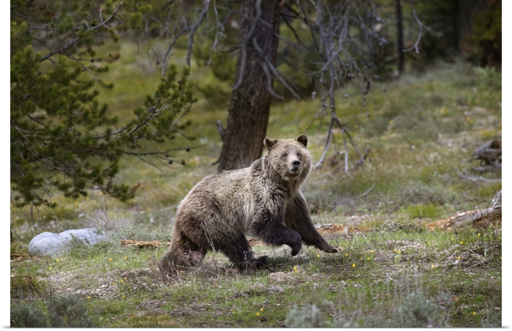 <p>USA, Wyoming, Grand Teton National Park. Sow grizzly running across a meadow. Credit: Don Grall</p>