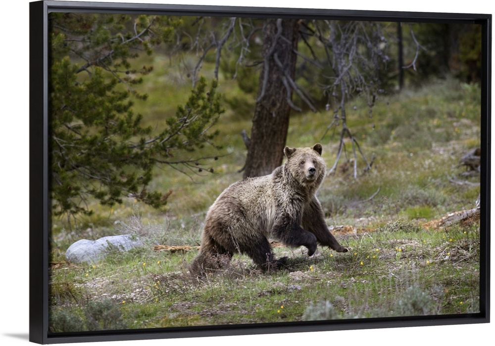 <p>USA, Wyoming, Grand Teton National Park. Sow grizzly running across a meadow. Credit: Don Grall</p>